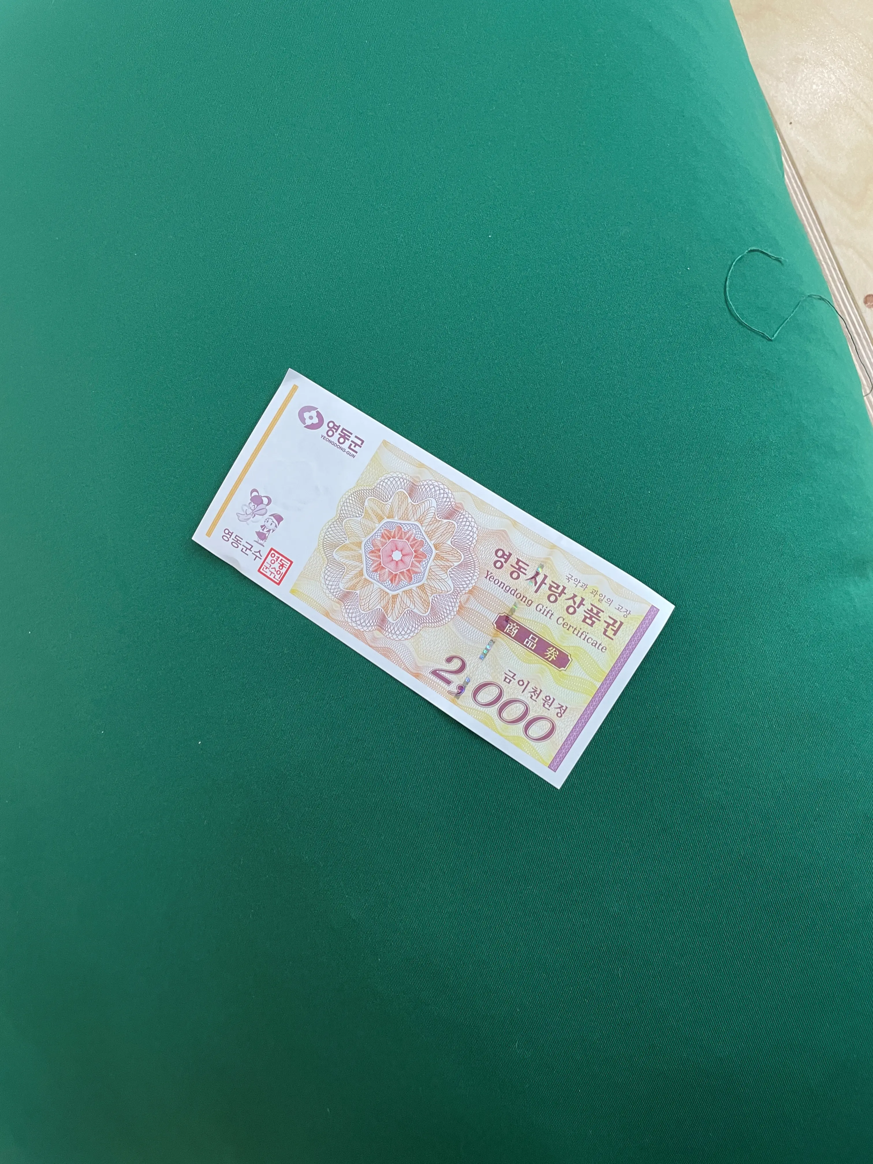 영동군 내에서 현금처럼 쓸 수 있는 지역 상품권입니다. 힐링센터 방문하시고 저녁 식사 하실 때 사용하면 좋을 것 같습니다 ㅎㅎ