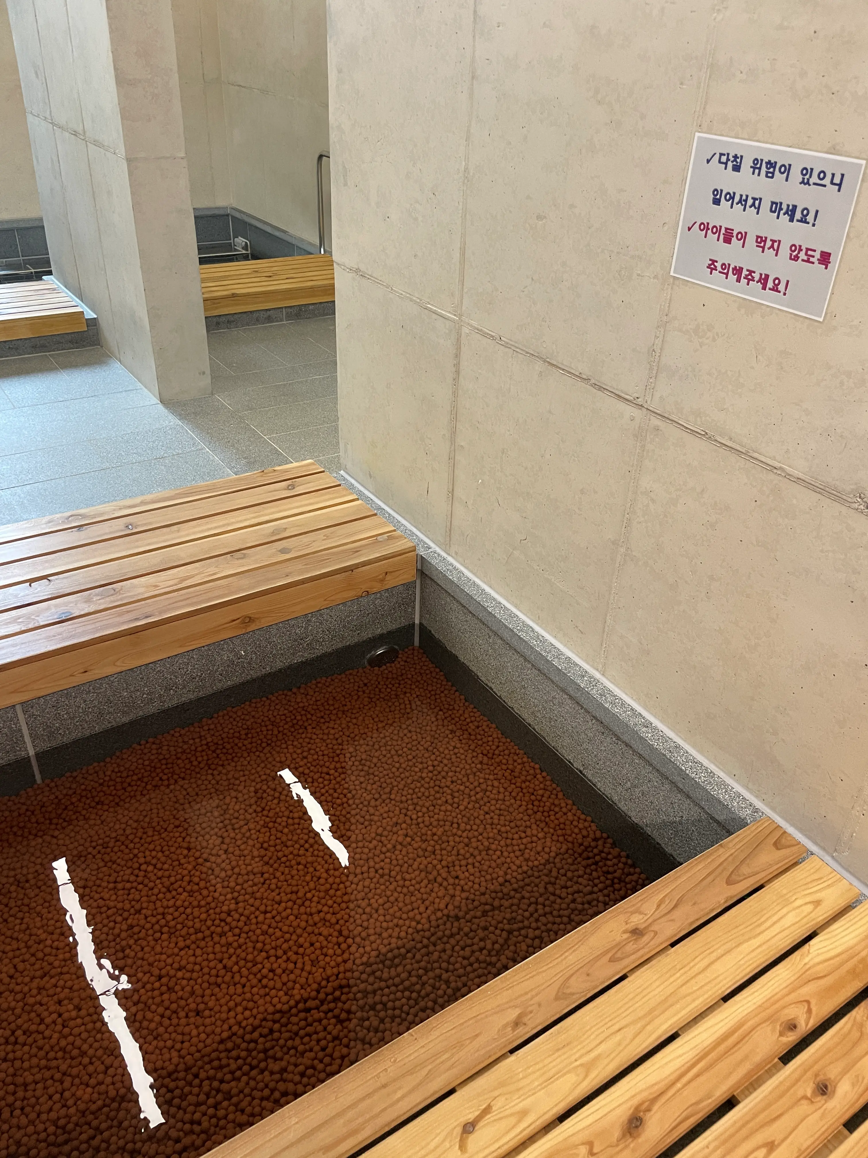빨간색으로 보이는 곳에는 동글동글한 돌이 있어서 지압하면서 족욕을 즐길 수 있고, 바깥의 돌을 보면서 돌멍과 함께 족욕을 즐길 수도 있습니다.