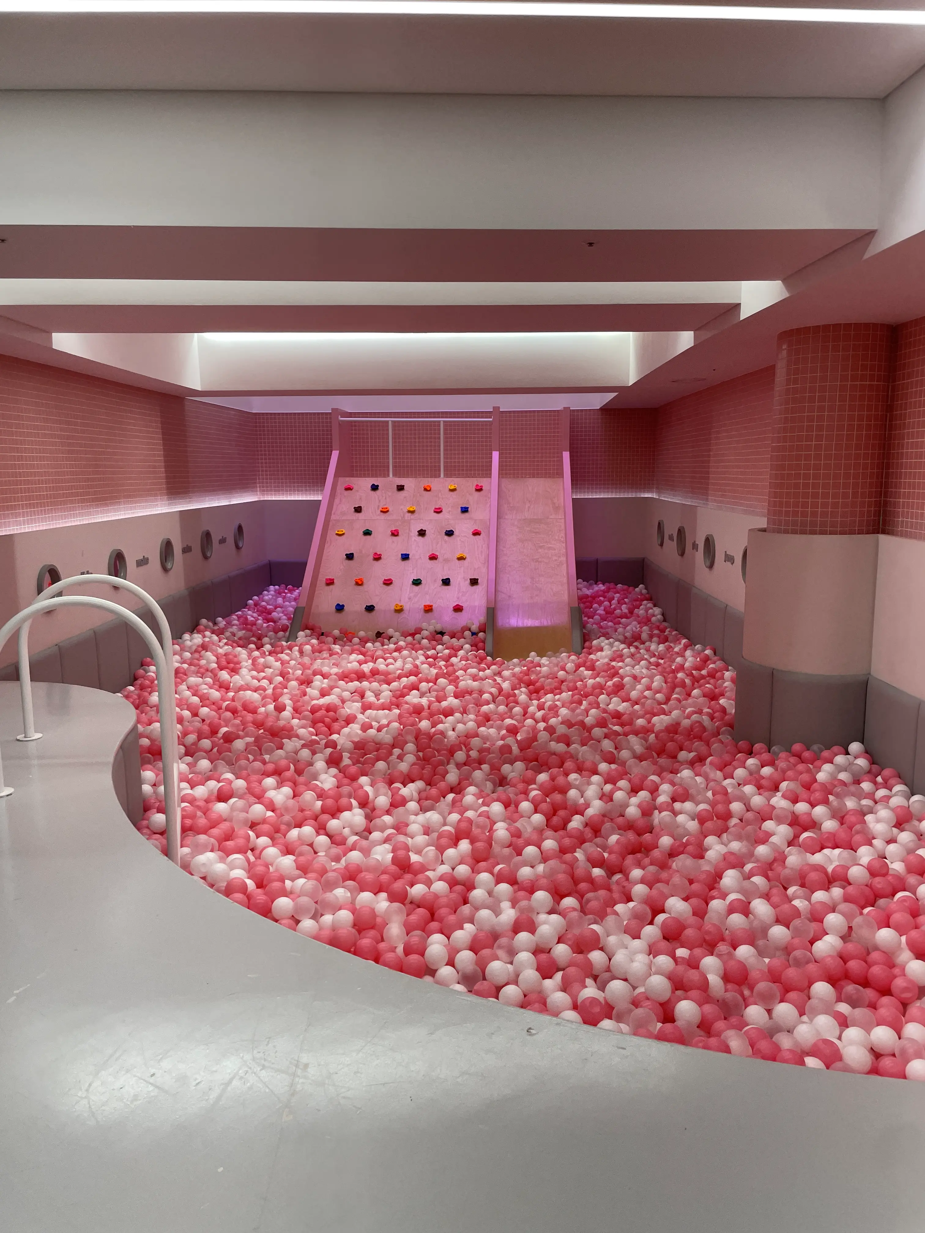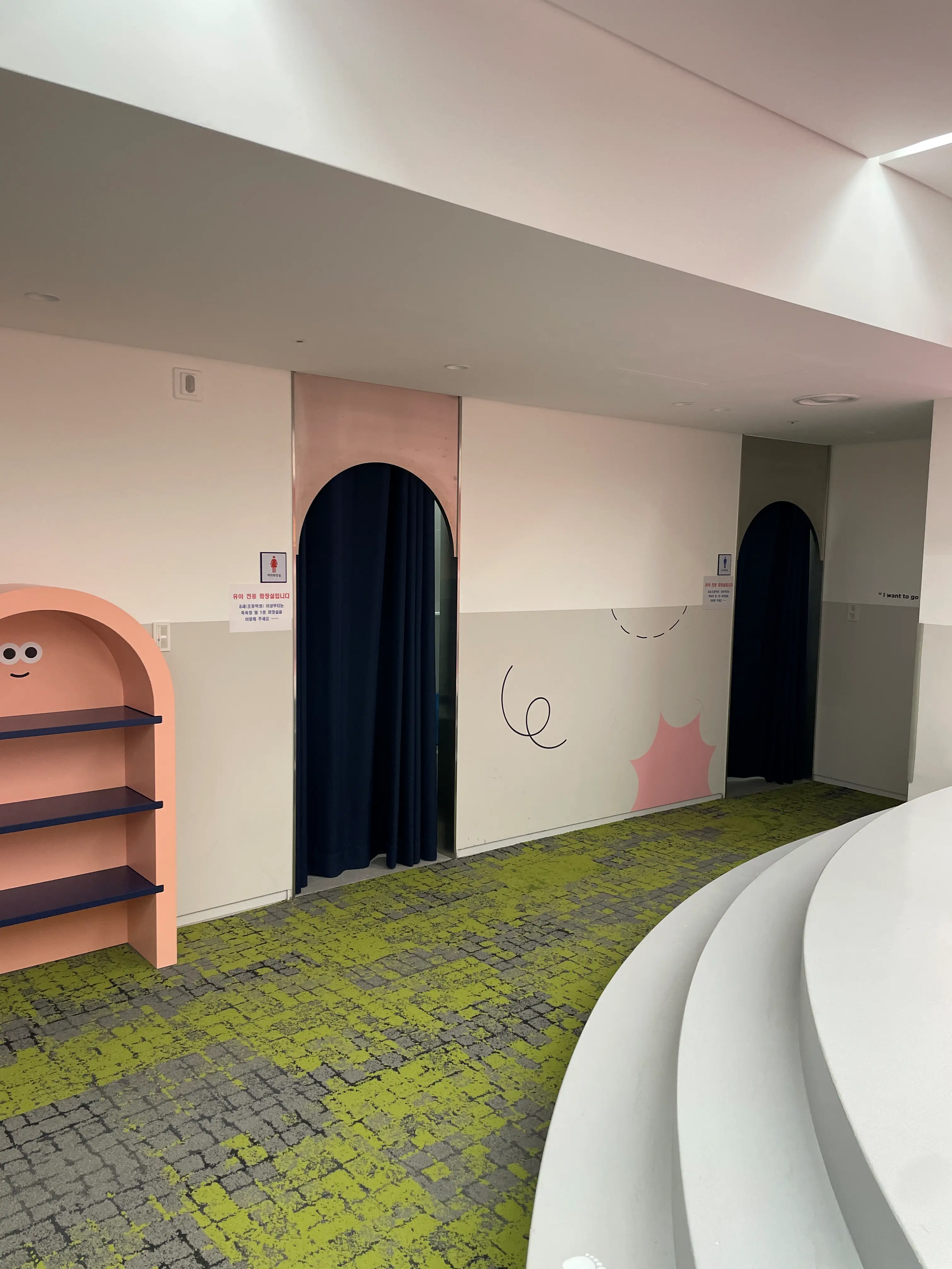 안에는 이렇게 아이들이 놀 수 있는 공간과 분홍색으로 이루어진 볼풀장, 바로 옆에 어린이화장실이 같이 있습니다.