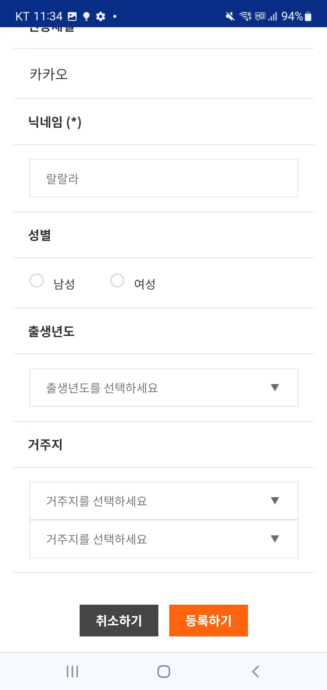약관 동의를 진행하고, 닉네임, 성별, 출생년도와 거주지를 입력하시면 회원가입이 완료됩니다.